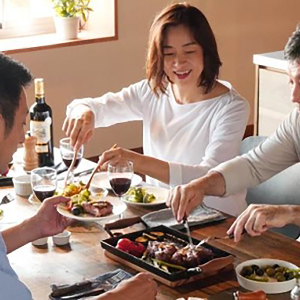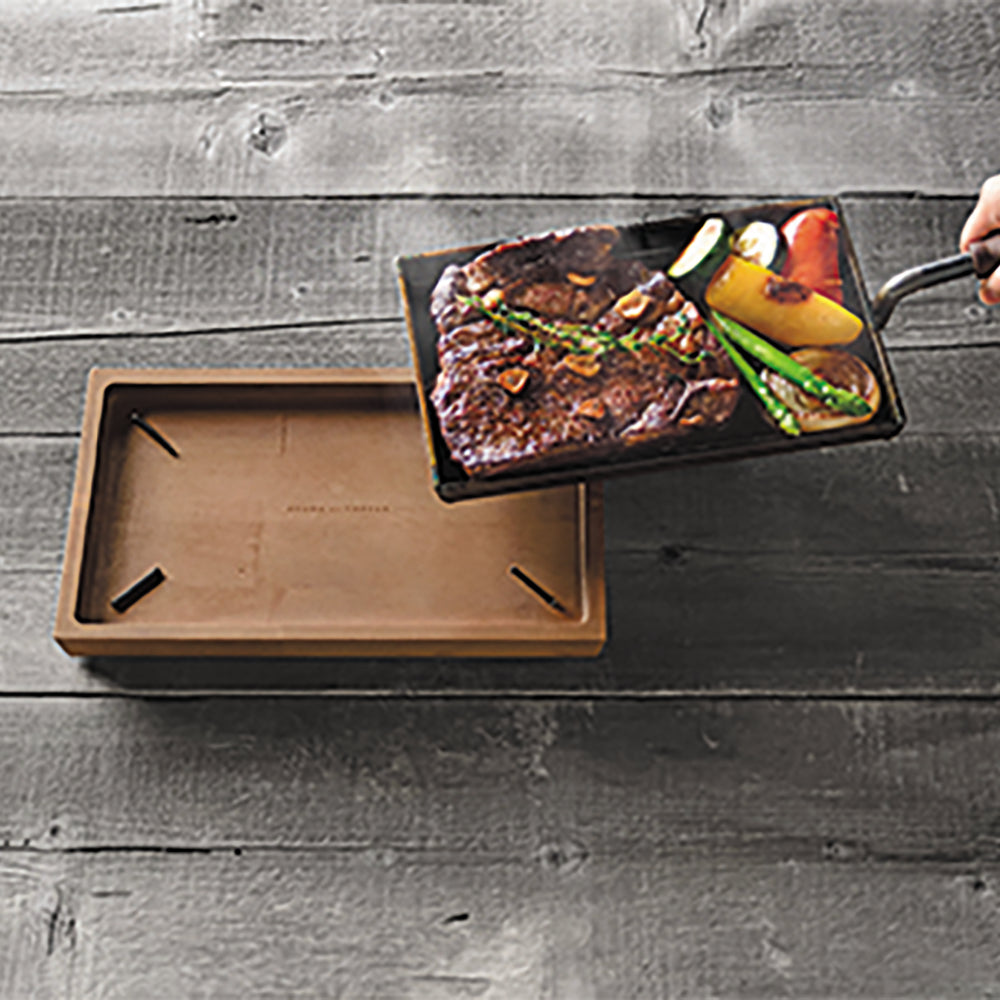 大人的鐵板蓄熱性高,一旦鐵板加熱了,即使將冰鮮肉片放上去也不會使鐵板溫度下降。瞬間煎烤肉的外層,將美味封住。料理完後,搭配專屬隔熱墊直接上桌享用,也可使用桌上型IH爐,輕鬆於餐桌上煎烤,或是戶外露營時直接在直火上使用,與親友一同享受美妙的滋滋聲響。