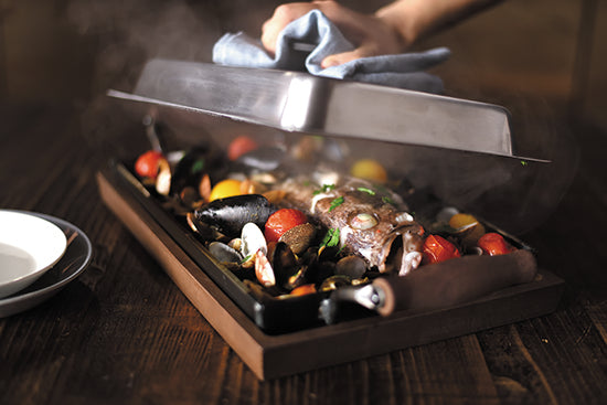比一般市售平底鍋的保溫力高,在加熱停止或料理完成後,直接端上桌便可品嚐到持續保溫的熱食。搭配加蓋的使用,除了肉類、海鮮或蒸蔬菜也能同時一起處理,打開蓋子的瞬間爆發美味。還可以試試蒸魚、烤漢堡排或煎餃子.....等料理。