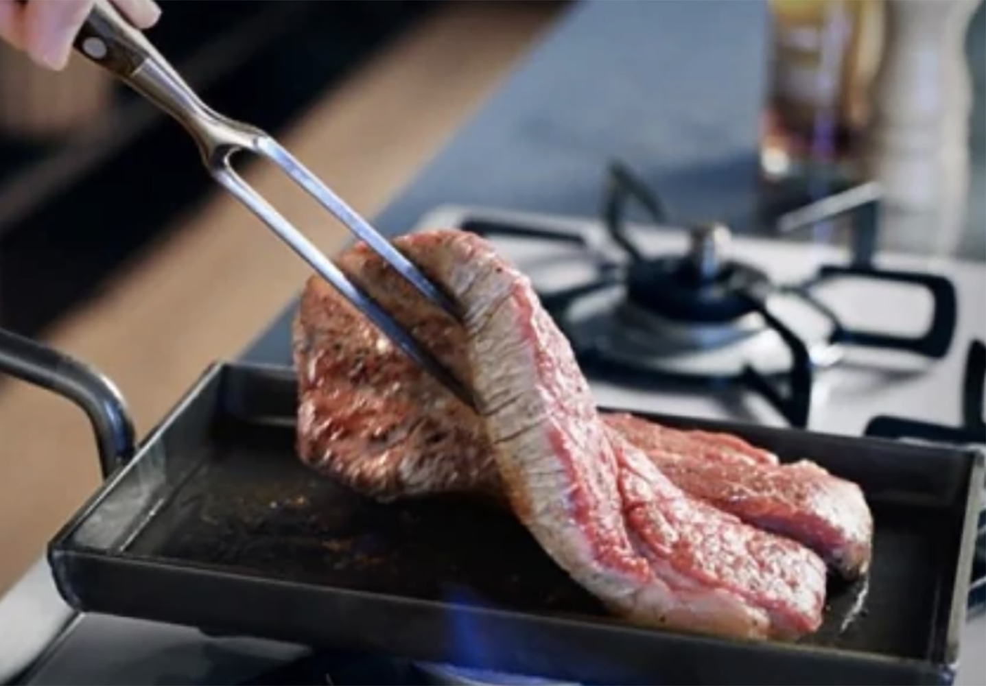 一般煎鍋和高級鐵板燒餐廳之間的區別在於熱量如何傳遞到肉類。市售的薄平底鍋只在局部火源的地方才會變熱,導致燃燒不均勻。「大人的鐵板」具有4.5mm厚度,因此熱量沿水平方向傳遞並且將食材溫和地加熱。因此,在不燒焦表面的情況下,可以將熱量溫和均勻地傳遞到內部,肉切面的完美色澤。