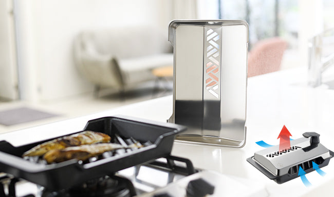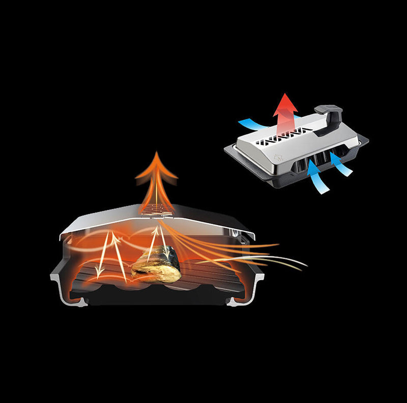 鍋蓋的上部與左右通氣孔是將魚皮烤得酥脆的重點設計。加熱時,左右開口能加速空氣對流,空氣流到上蓋時,也能適當蒸發水分,如此一來魚皮就不會變的濕軟。不鏽鋼鏡面設計還能反射遠紅外線,讓食材整體均勻加熱,形成最理想的燒烤狀態。除了魚,享受香脆雞皮、焦香吐司的味道和香烤野菜都不是問題!