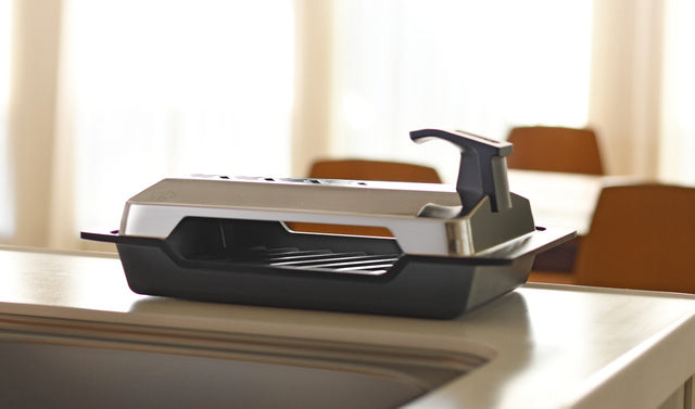 炭盤的遠紅外線效果與形狀獨特的鍋蓋相結合,能達成外皮酥脆內飽滿多汁的效果。炭(炭盤的原料)與普通鋁製烤盤相比,炭材比鋁材多達14倍的遠紅外線效果,能帶出食材的原汁原味。特製炭盤需要耗時100天才能製作完成。在高溫加熱的狀態下切割出來,日本職人一塊一塊慢慢削磨手工製作完成。